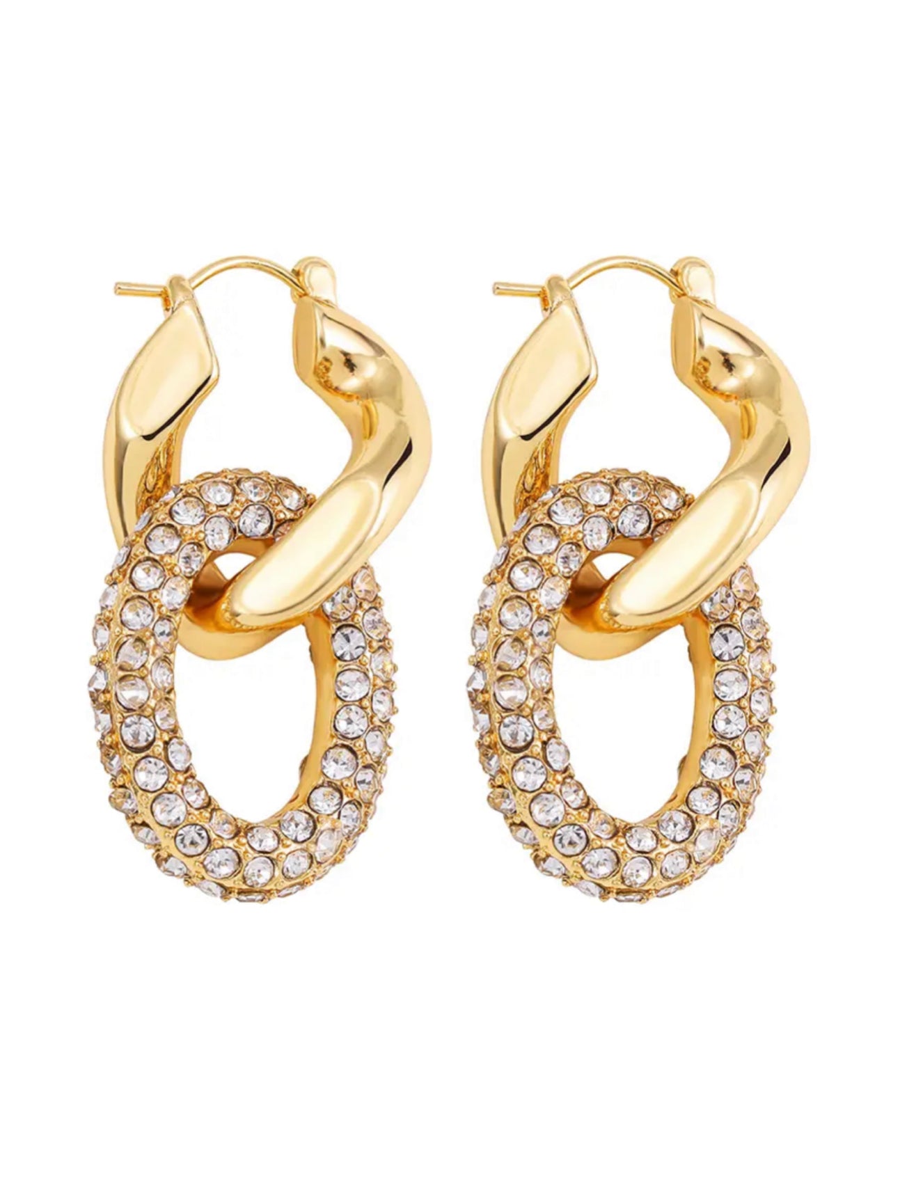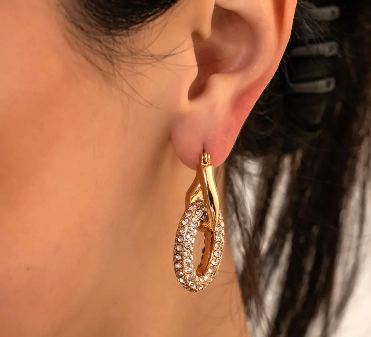 Gold hoops with interlocking loops encrusted with dazzling crystals