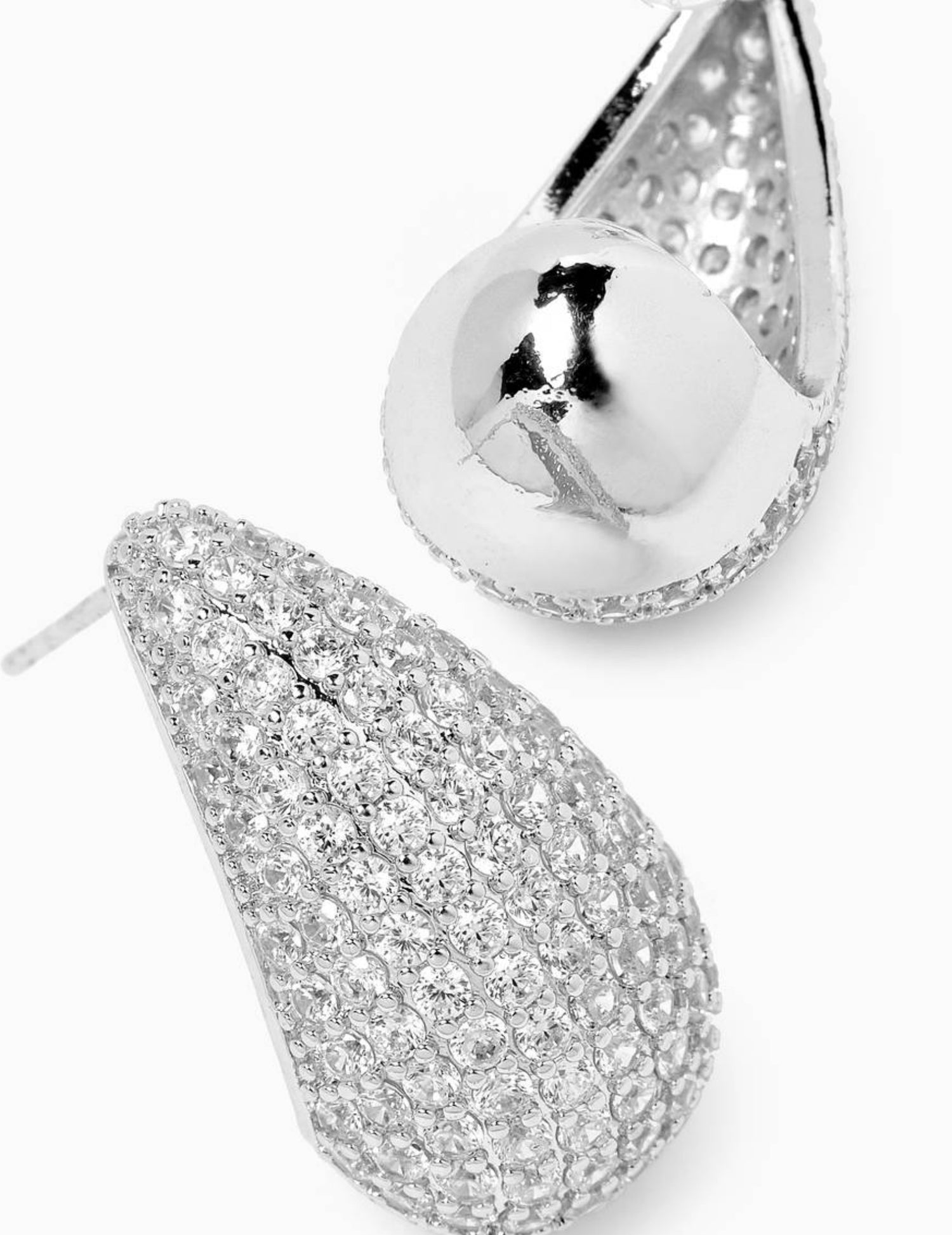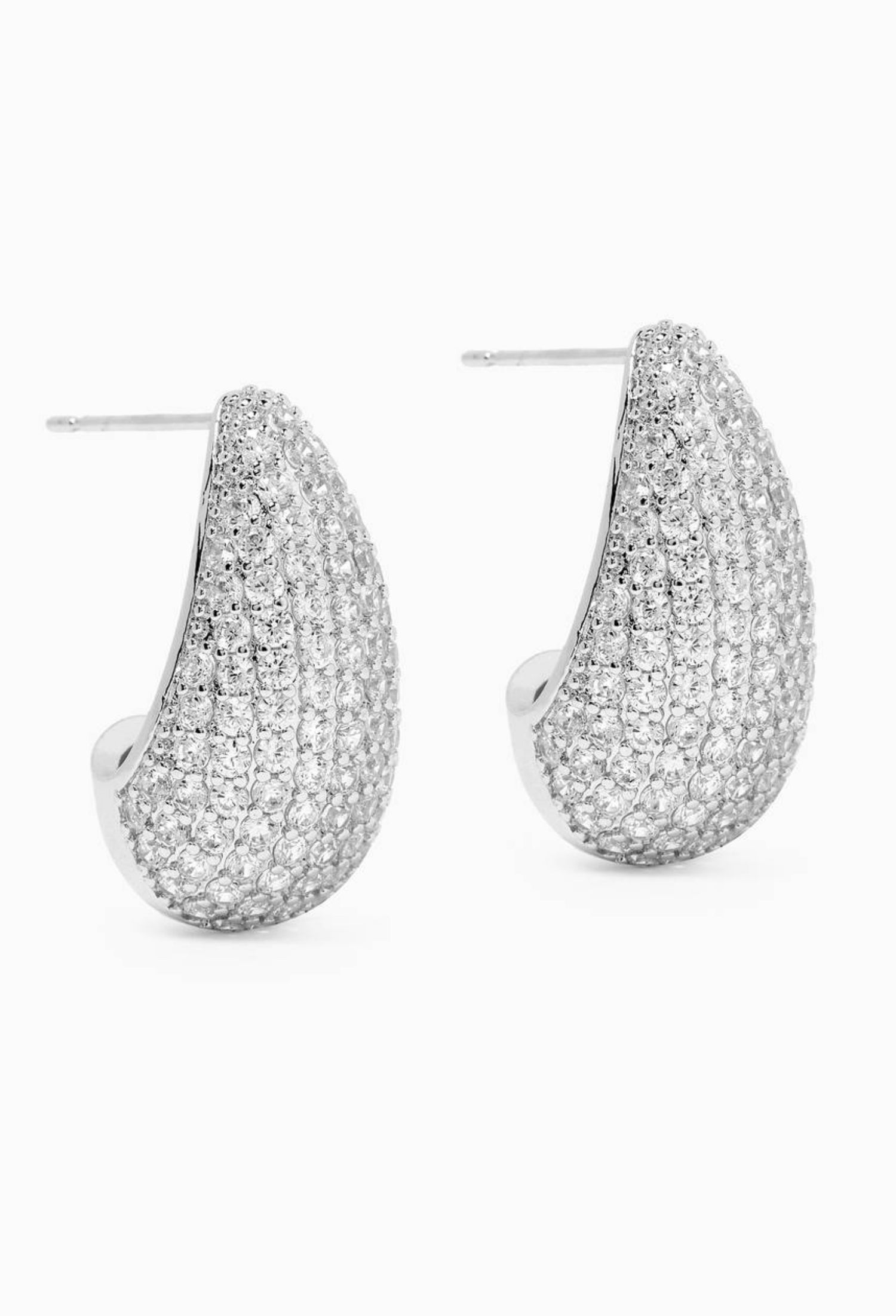 Teardrop-shaped silver earrings encrusted with rows of sparkling crystals